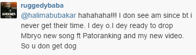 Replying her, Ruggedman wrote back, saying: ‘I don see am since but I never get their time. I dey o .I dey ready to drop Mbryo new song ft Patoranking and my new video.’