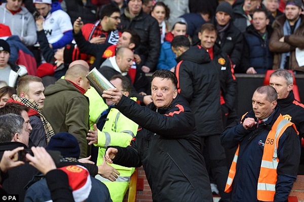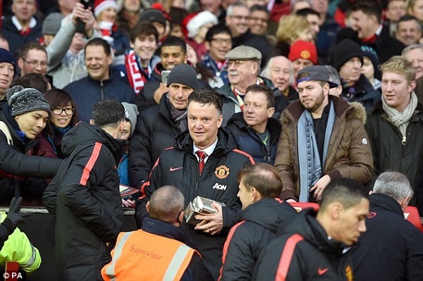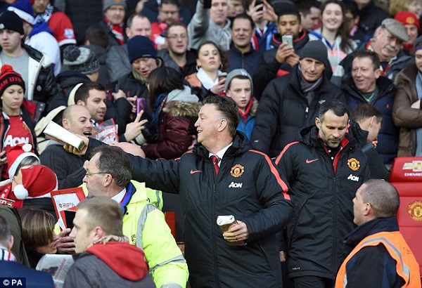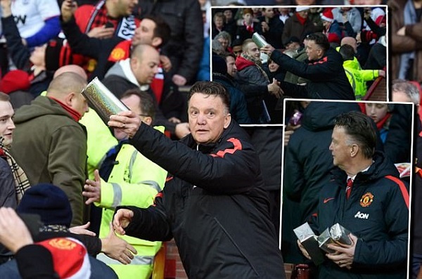 Red Devils boss, Louis van Gaal played the role of Santa Claus by giving out gifts to Manchester United fans at Old Trafford.