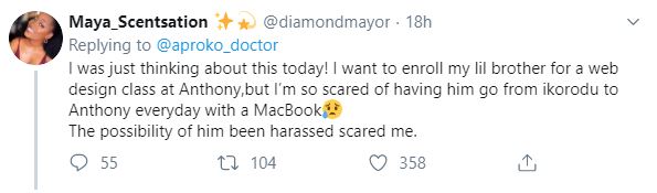 A young doctor shared his recent experience with the operatives in Mile 2 area of Lagos, and while several others painstakingly detailed their personal experiences in the thread, a Twitter user, @diamondmayor commented: “I was just thinking about this today! I want to enroll my lil brother for a web design class at Anthony, but I’m so scared of having him go from ikorodu to Anthony everyday with a MacBook. The possibility of him been [sic] harassed scared me.”
