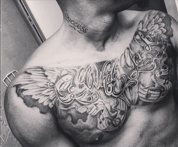 In 2015, the singer is stepping up his tattoo game as he’s just added more ink to his chest with the drawing of wings to surround his initial tattoo. Sean Tizzle, who is currently once again in Johannesburg, South Africa where he’s shooting the music video for his latest song, ‘Bottles’, excitedly shared pictures of his new and improved tattoo on Instagram yesterday, February 16, 2015.
