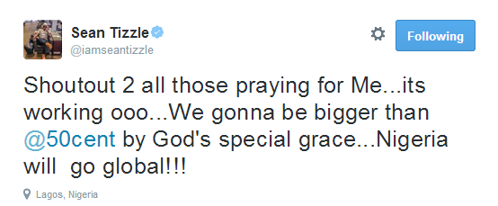 The singer, who dropped his award winning debut album, The Journey in 2014, took to Twitter to appreciate his fans writing: ‘Shoutout 2 all those praying for Me…its working ooo…We gonna be bigger than 50cent by God’s special grace…Nigeria will go global.’