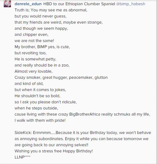 With today, February 4, 2015, being the Ethiopian man’s birthday, Denrele posted Bimp’s picture with a rather long and weird birthday message which reads: ‘HBD to our Ethiopian Clumber Spaniel @bimp_habesh…Truth is; You may see me as abnormal, but you would never guess, that my friends are weird, maybe even strange, and though we seem happy, and chipper even, we are not the same!