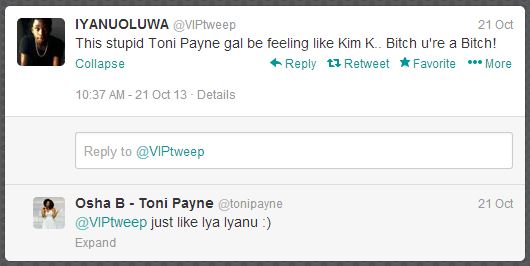 The young man had tweeted: ‘This stupid Toni Payne gal be feeling like Kim K.. Bitch u’re a Bitch!””‘. Toni replied mentioning him ‘just like Iya Iyanu‘, taking a swipe at the kid’s mother. Adesiyan then attempted to raise hell storm on his Twitter looking for a fight, crying out, ‘Toni Payne insulted my mother‘.
