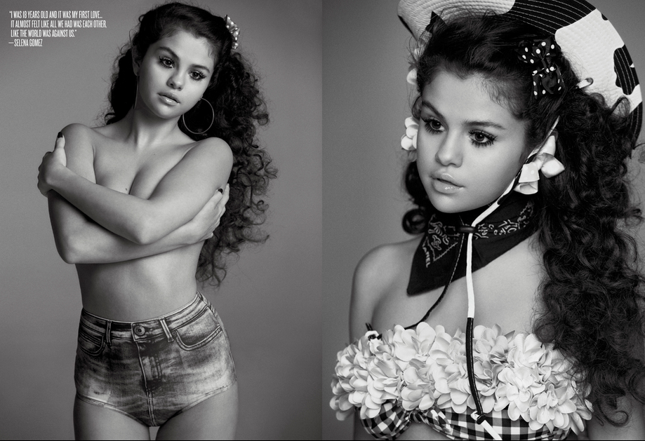 In one of the photographs, topless Gomez was seen crossing her arms to cover her breasts. She only wore a pair of tiny pants with her hair styled in small, voluminous curls. She accentuated her baby face with dramatic lashes and some accessories like hop earrings and a red polkadot bow.