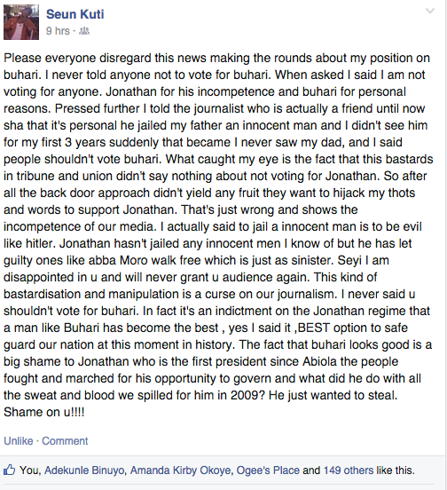 The singer took to his Facebook page to discredit the claims as he sought to make things plain for his fans and the general public. Not one to shy away from hitting out, Seun came for Nigerian President, Goodluck Jonathan, Abba Moro and others in the lengthy post.