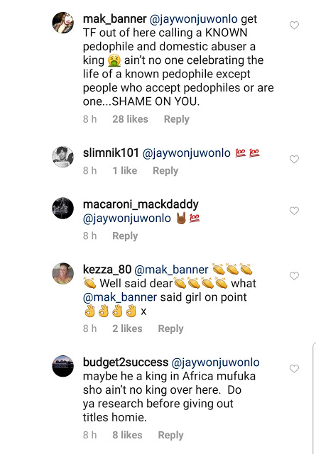 Nigerian singer, Jaywon is got more than he’d have expected after getting bashed on American rapper, 50Cent’s Instagram page for wishing embattled RnB singer, R. Kelly a happy birthday and calling him a ‘KING’.