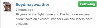 In his first Instagram post since the May 2, 2015 bout last weekend, Mayweather has written: ‘Losers always give excuses’ in apparent reference to Manny’s post match compliant about a shoulder injury.
