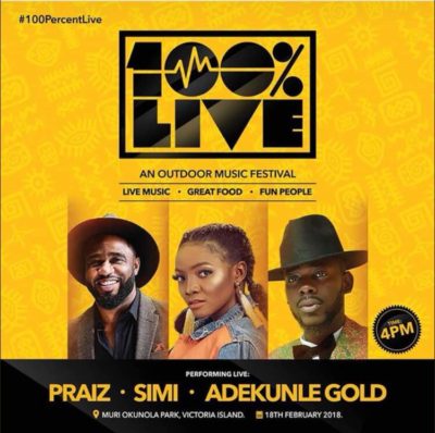 The biggest live music concert in Nigeria, 100% Live features the best alternative and mainstream music artistes known for their unique style and music in a festival-like atmosphere all within a picnic-style setting. 100% Live debuts on February 18th, 2018 at Muri Okunola Park, Victoria-Island. Tickets for the show is available on https://buy.thenet.ng/event/100-live/