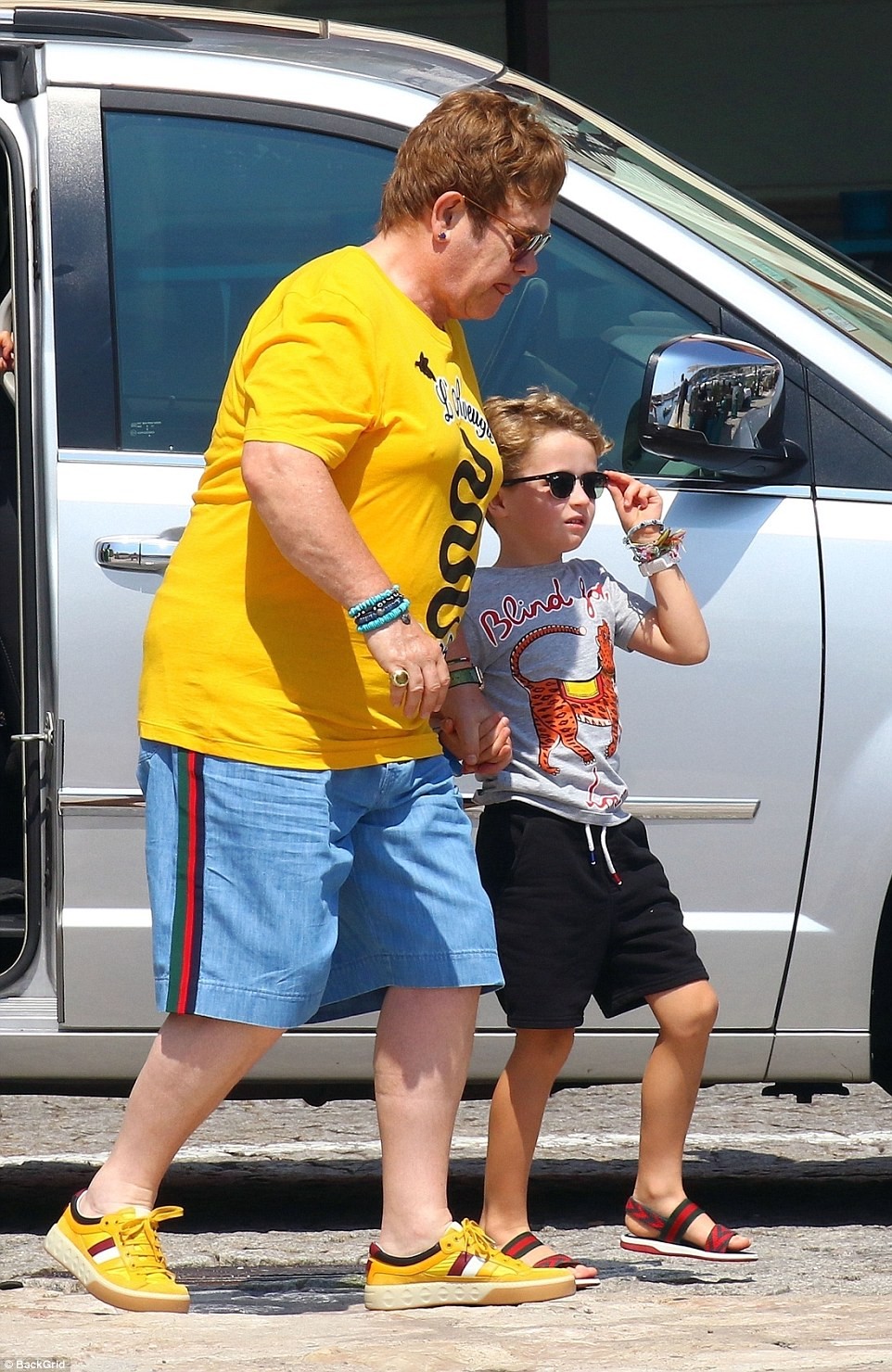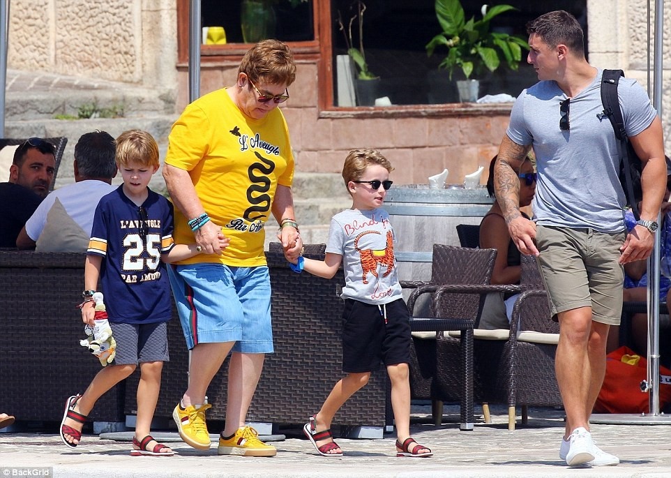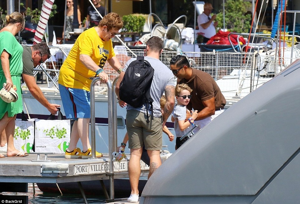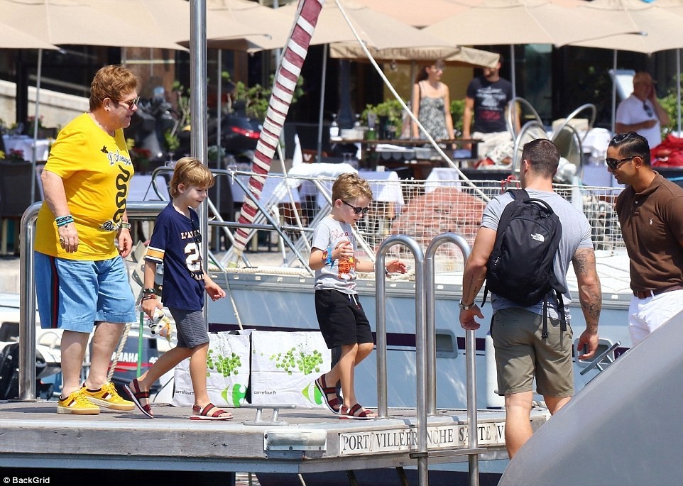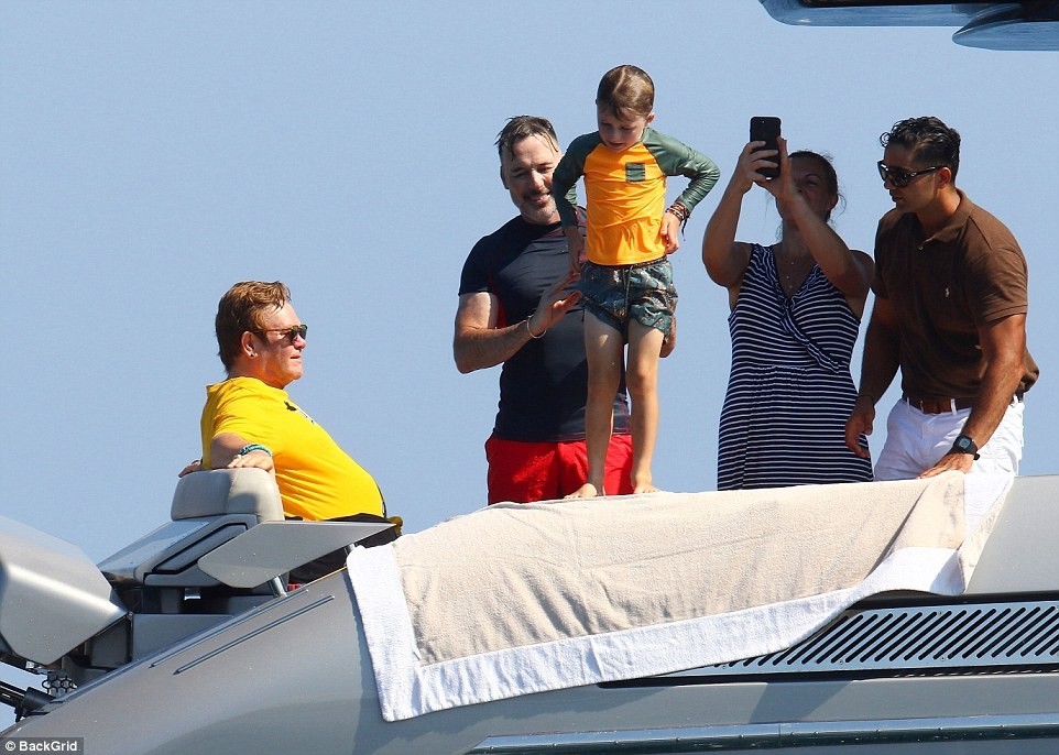 The 71-year old iconic singer, was pictured soaking up the sun with his husband David Furnish, 55, and their young sons Zachary( seven) and Elijah(five) aboard his luxury yacht in Cannes, France on Sunday.