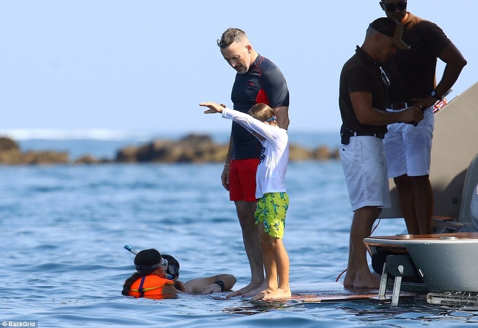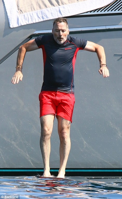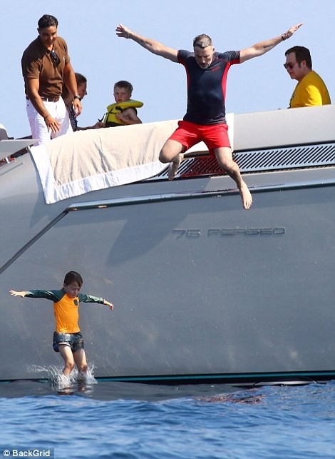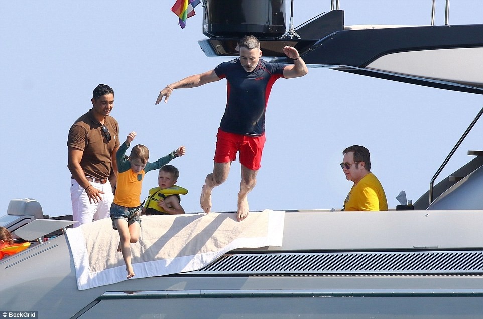 While David and his sons took a dip into the sea, Sir Elton was seen relaxing on the yacht as he watched on
