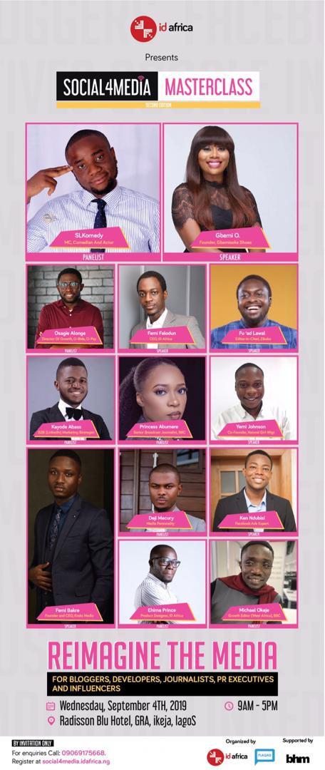 Social4Media Masterclass, which is also supported by BlackHouse Media (BHM) first held in November 2017. The maiden edition featured presentations by MI Abaga, Alibaba, Frank Donga, Osagie Alonge, Tomiwa Aladekomo, Yemi Adamolekun, Ayeni Adekunle and others. To attend the Social4Media Masterclass, register on https://social4media.idafrica.ng/ .