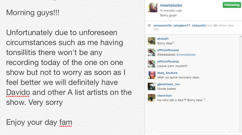 Making the announcement via her Instagram account earlier today, Moet urged her fans to bear with her as she won’t be able to record her show till she gets better.