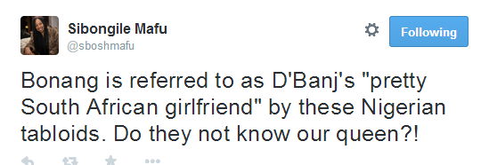 A very angry Sibongile Mafu took to Twitter to address the issue saying: ‘Bonang is referred to as D’Banj’s ‘pretty South African girlfriend’ by these Nigerian tabloids. Do they not know our queen?’