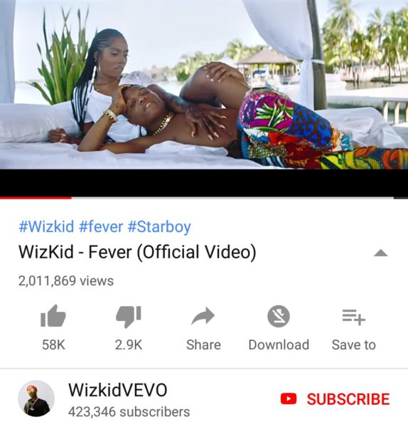 Starboy Wizkid has reached 2million views on YouTube for his new trending music video titled ‘Fever’, staring Tiwa Savage.