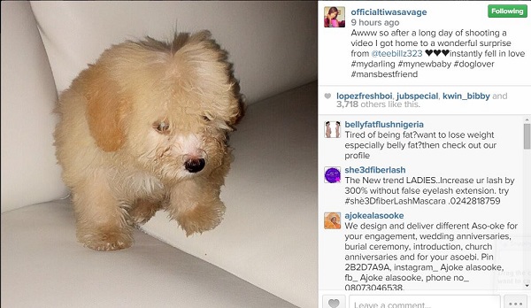 An indication came from Tiwa Savage earlier today who showed off her cute new puppy which she got as a gift from her husband and former manager better known as Tee Billz.