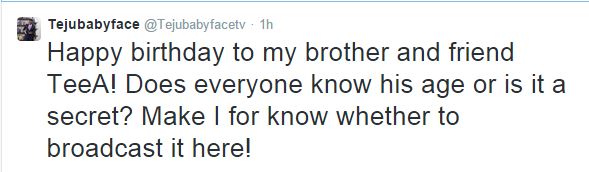 His other tweet was more like it though: ‘Happy birthday to my brother and friend Tee A! Does everyone know his age or is it a secret? Make I for know whether to broadcast it here!