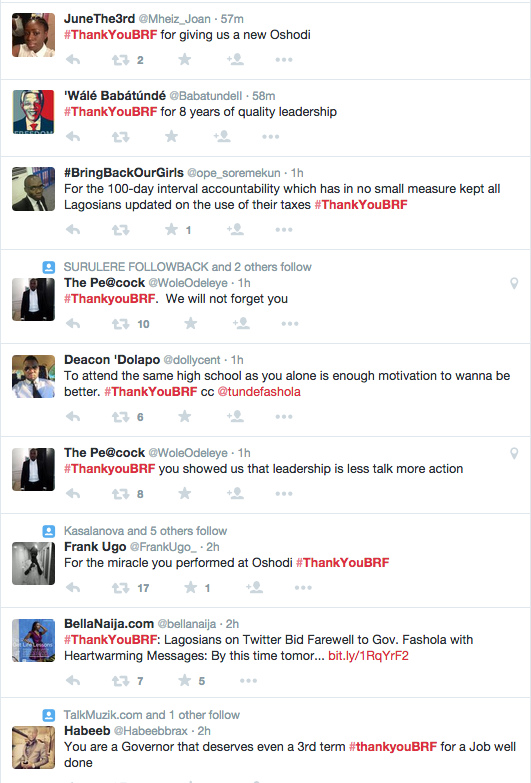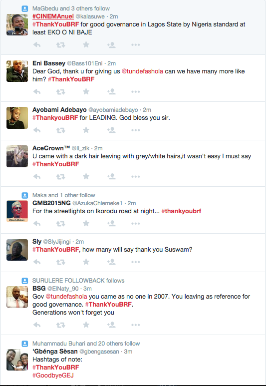 As Babatunde Fashola, who has ruled Lagos State for the last eight years exit power, having handed over power to the new governor, Akinwunmi Ambode, Lagosians have taken to Twitter to bid him farewell and thank him for the good job he did.