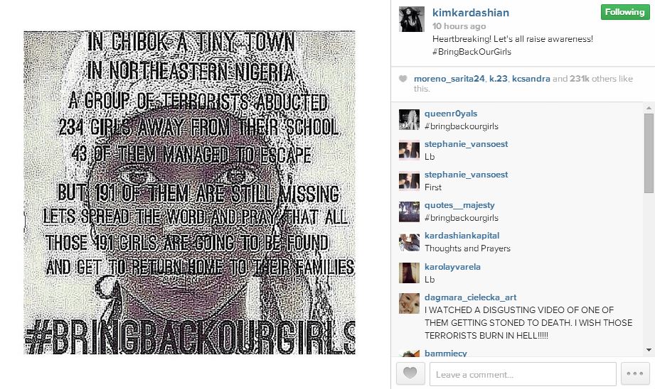 Kim Kardashian took time off her busy wedding planning schedules to identify with Nigerians over the missing 200 plus girls abducted by Islamic group Boko Haram. On her Instagram page, she posted one of the many online campaign photos and then wrote;