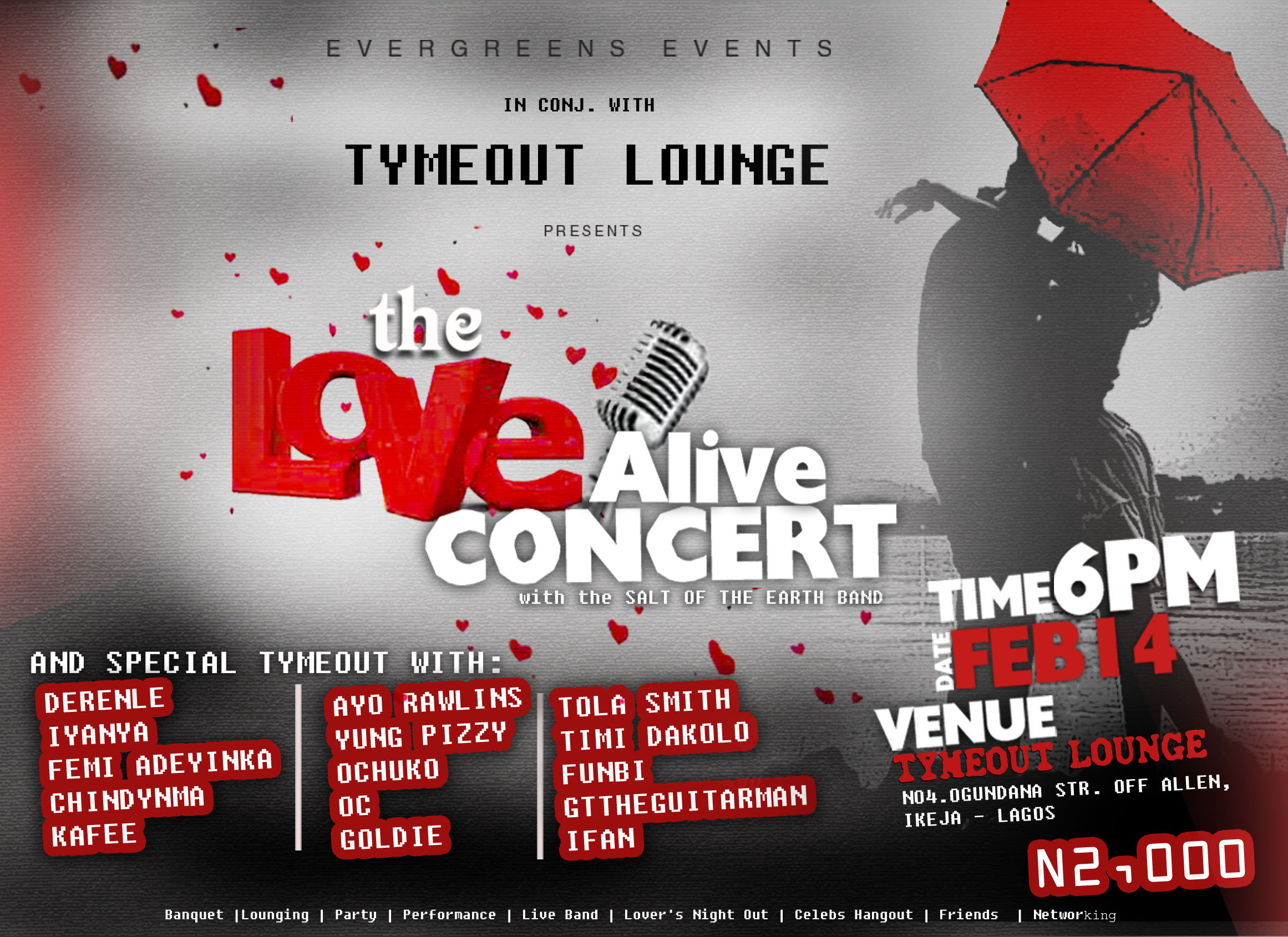 The Love Alive Concert holds on Monday February 14, at TymeOut Lounge, inside Ivory Health Club, on Ogundana Street, Ikeja, Lagos.