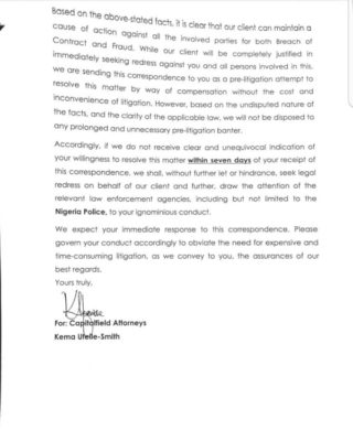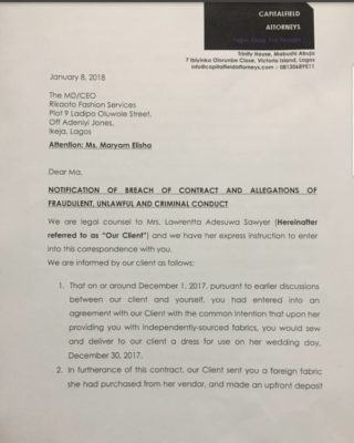 NET sighted a letter addressed to the designer by the bride’s legal representatives Capitalfield Attorneys read: “Notification of Breach of Contract and Allegations of Fraudulent, Unlawful and Criminal Conduct,” saying that if the designer is not willing to resolve the matter within seven days by way of compensation, their client will not hesitate to seek further legal action.