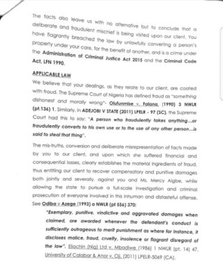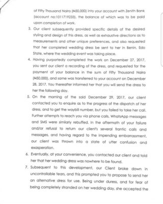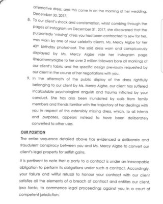 The lawyers said that the bride seeing how her ‘missing’ dress had been displayed by Mercy Aigbe to her 2 million plus followers had suffered “psychological anguish and trauma” and that Mercy Aigbe and the designer Rikatobyme had deliberately converted a property belonging to their client for their personal and selfish gains.