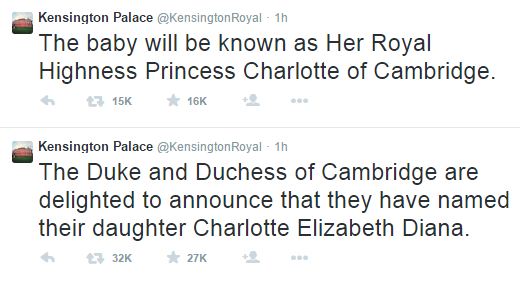 Official announcement from Kensington Palace reads: ‘The Duke and Duchess of Cambridge are delighted to announce that they have named their daughter Charlotte Elizabeth Diana. The baby will be known as Her Royal Highness Princess Charlotte of Cambridge.’