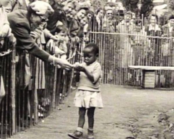This viral photo of a little African girl being fed from behind a wooden barricade was taken in Brussels, Belgium in 1958.