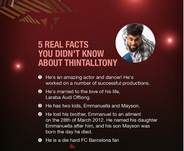 While Big Brother Naija housemate Thin Tall Tony is having a blossoming romance with fellow housemate, Bisola, his wife took to Instagram to share five facts about him.