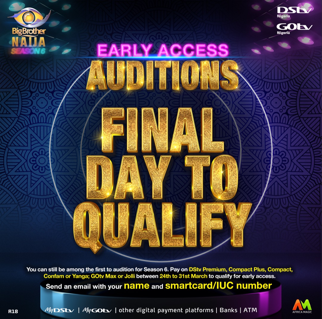 All that is required of you is to pay your DStv or GOtv subscriptions between 24th to 31st March (today!); after that, you send an email with your smartcard or IUC number to this email address; Africamagicevents@ng.multichoice.com. You will receive a website link to complete the registration, and voila! You stand a chance to audition to be a member of the Big Brother House!