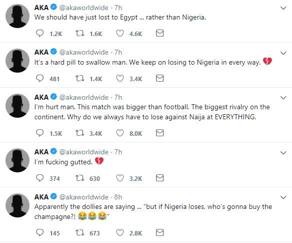 AKA then replied to him asking “Are you talking about this guy?”, accompanied with a picture of himself wrapped in the Nigerian flag in front of a painting of Fela. Ycee was quick to respond that he was talking about ‘THIS’ guy and added a screenshot of the thread that AKA had made about South Africa losing to Nigeria. AKA had said at the time that he would have preferred the country to lose to Egypt instead of Nigeria, with claims that the match was more than just football. He said it was the biggest rivalry on the continent. He then lamented “why do we always have to lose against Naija at EVERYTHING.”