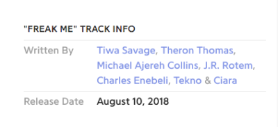 However, our new findings in some way defy the notion that Tekno or Ciara stole the song from Tiwa Savage as she is publicly credited as a writer. Seen on popular music platform, Genius, Tiwa Savage receives the first credit as a songwriter of Freak Me. Don Jazzy (Michael Ajereh) and D’Prince (Charles Enebeli) who also featured Tiwa’s version all received songwriters credits and this begs the question; why is Tiwa upset?