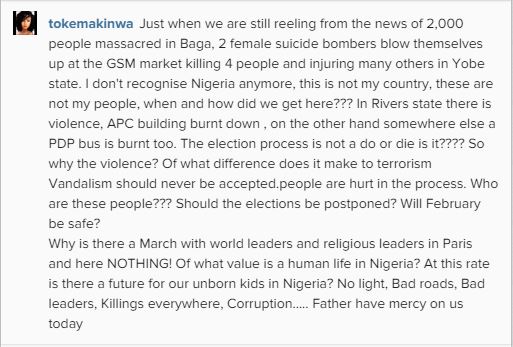 OAP and TV host, Toke Makinwa has lamented the current state of insecurity and wave of terror that have engulfed the northern part of Nigeria, stating that she does not recognise the country anymore.