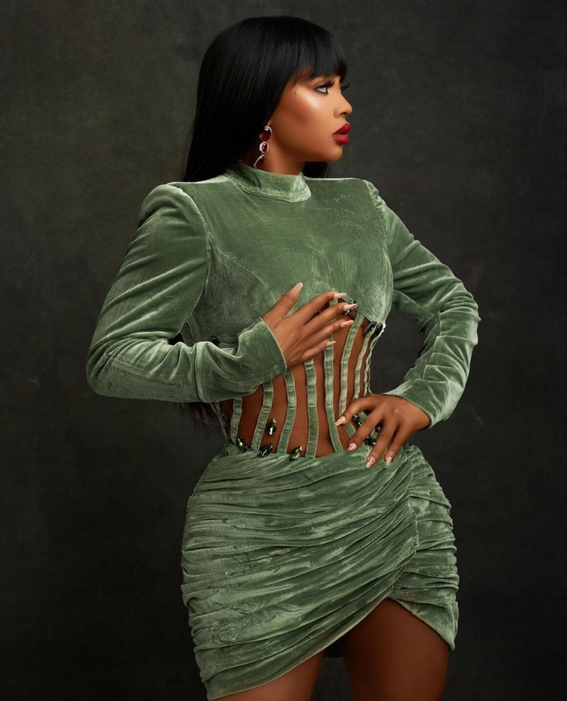 By wearing the crisp hue from head to toe, the self-proclaimed ‘Queen of The Buzz’ gave this outfit a strong ‘hell yes’ on the set of The Buzz – a BBNaija highlight show that airs only on Showmax. She looked elegant in the green velvet long-sleeve corset dress.