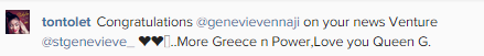The launch, which took place on Saturday, October 4, 2014 had other actresses like Funke Akindele and Stephanie Okereke-Linus in attendance but Tonto, who was not at the event, took to social media a day afterwards to congratulate Genevieve, writing: ‘Congratulations Genevieve Nnaji on your new Venture St Genevieve. More Grease and Power, Love you Queen G’ even if we have to help her correct the ‘news’ and ‘Greece’ in her tweet.