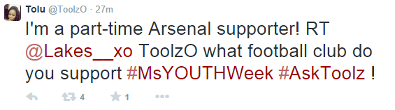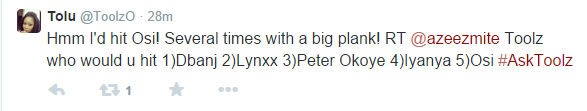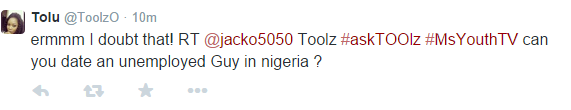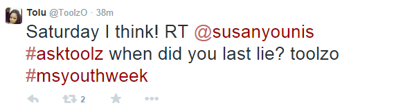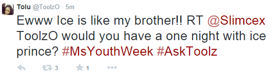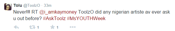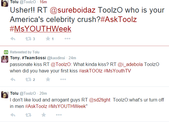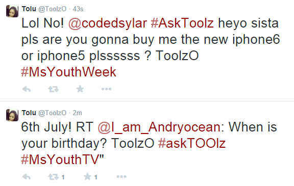The platform hands fans the opportunity to ask Toolz any question they like with the hashtag ‘#AskToolz’. The Ms Youth Week Twitter interview would feature more celebrities such as Dj Spinall, Dj Cuppy, Stephanie Coker and Zamir in the coming weeks.