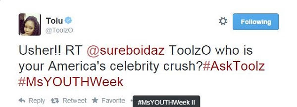 Popular Nigeria on-air-personality Tolu ‘Toolz’ Oniru has revealed that she has a crush on American R & B singer, Usher Raymond.