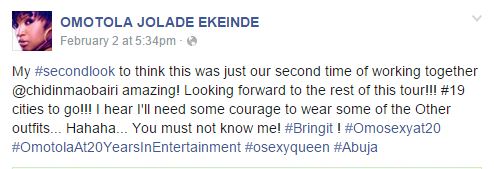 According to Omotola herself, the designer has said she will ‘need some courage to wear’ some of her other designs. Omotola disclosed this in a recent Facebook post, saying: ‘I hear I’ll need some courage to wear some of the Other outfits… Hahaha… You must not know me! #Bringit ! #Omosexyat20 #OmotolaAt20YearsInEntertainment#osexyqueen #Abuja.’