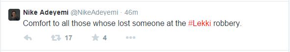 Among celebrities who have spoken on the robbery attack are Nollywood actress, Omoni Oboli, OAPs, Toolz and Maria Okanrende, DJ Spinall and Nike Adeyemi who have all prayed for the families of the deceased and injured victims.