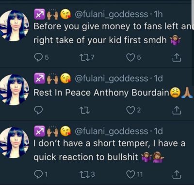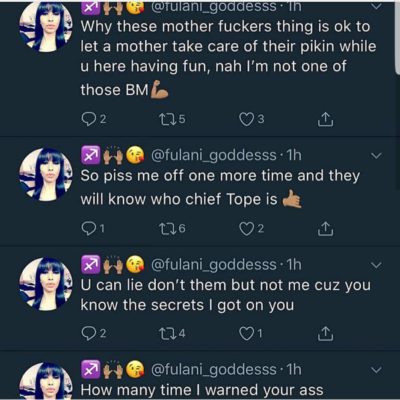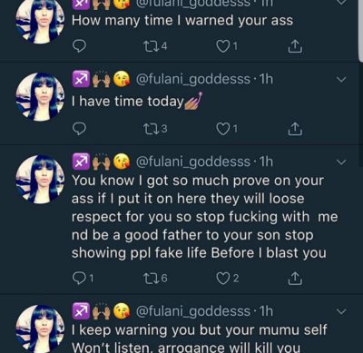 The Lady, Layla Amani who released a series of tweets with her twitter handle (@fulani_goddesss is not having it with the BigBrother star who she described as a deadbeat father.