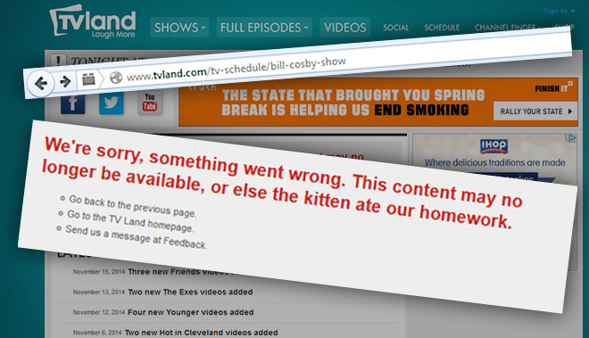 The website allows users to watch video clips of the show and get info about air dates but recently, the network has deactivated all of the ‘Cosby’ links. If you click the link now, it takes you to an error page.