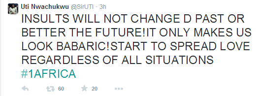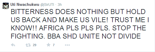 In a bid to make peace and quell the bitter tension, Uti Nwachukwu who won the 5th edition of the Big Brother Africa, has taken to Twitter to calm frayed nerves with words of peace, saying: ‘Insults will not change the past or better the future. It only makes us look barbaric. Start to spread love regardless of all situations.’