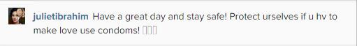 Whil posting his picture on Instagram, she added the caption: ‘Have a great day and stay safe! Protect urselves if u hv to make love use condoms!’