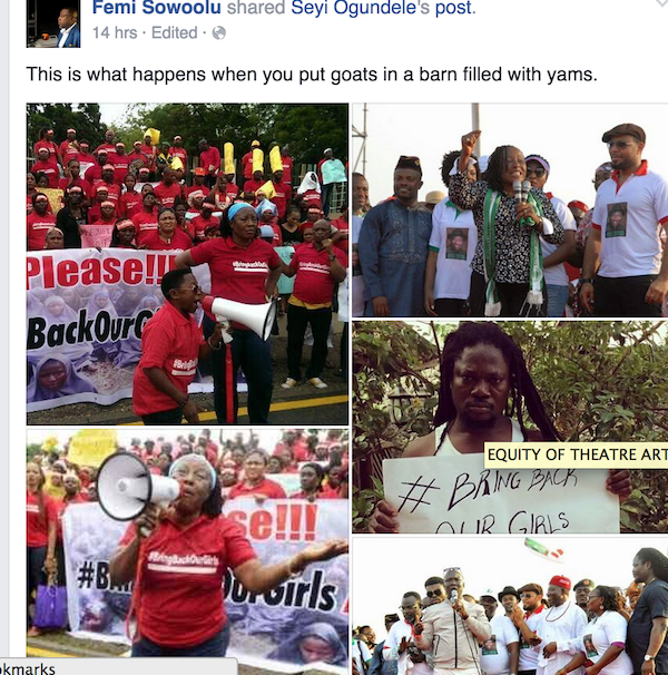 The broadcaster posted a picture on social media today, March 5, 2015 which showed the entertainers actively leading protests against the Goodluck administration over the abduction of over 200 girls in Chibok, Borno State by Boko Haram in 2014 on one side. It also showed the same entertainers now in full support of the same administration and even publicly campaigning for the incumbent President on the other.