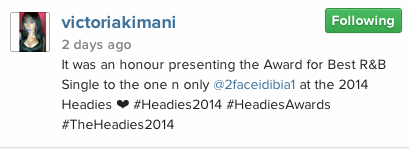 Kimani posted a picture of the stunning dress she wore to the presentation on her social media handle with the caption: ‘It was an honour presenting the Award for Best R&B Single to the one n only @2faceidibia1 at the 2014 Headies #Headies2014#HeadiesAwards#TheHeadies2014.’