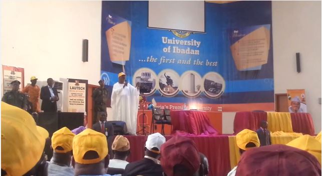 Oyo State Governor Abiola Ajimobi was trying out his vocals while giving a speech at the University of Ibadan last week and decided to sing his current favourite songs which included Davido‘s smash hit ‘Dami duro‘.