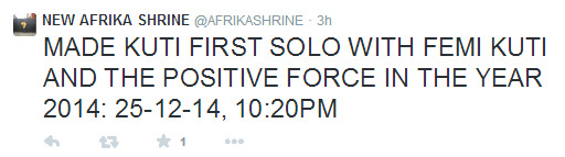 On Christmas day December 25, 2014, afro beat King, Femi Kuti performed live on stage at the New Afrikan Shrine alongside his first son, Made Kuti.