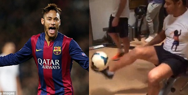 In the video posted by the Barcelona striker on his Instagram Page on Monday, December 15, 2014, Neymar Snr is seen in a gym as he throws a football up in the air and starts kicking the ball with his foot several times.