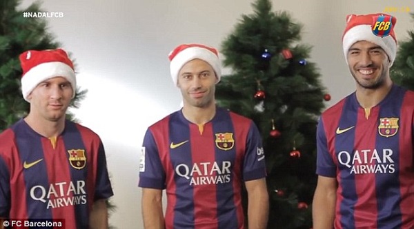 In the club’s countdown to Christmas YouTube video series, it features South American trio of Lionel Messi, Luis Suarez and Javier Mascherano, who were directed to stare into the camera before Messi started the show by saying ‘Happy Chrismas’ before Suarez and Mascherano also lend in their voices saying: ‘Have a great year full of happiness.’