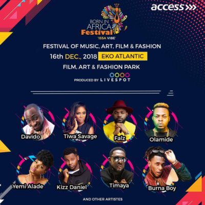 On Sunday December 16, Born In Africa Festival– a festival of music, fashion, art and film- will hold at Eko Atlantic City. It will be headlined by some of Africa’s biggest superstars, across the different industries including the likes of Davido, Burna Boy, Tiwa Savage, Yemi Alade, Dbanj, Olamide, Falz Kizz Daniel, Awilo Longomba and so much more.