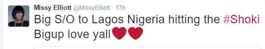 On Sunday November 15, Missy sent a shout out to the home of Shoki, Lagos, Nigeria, via Twitter.
